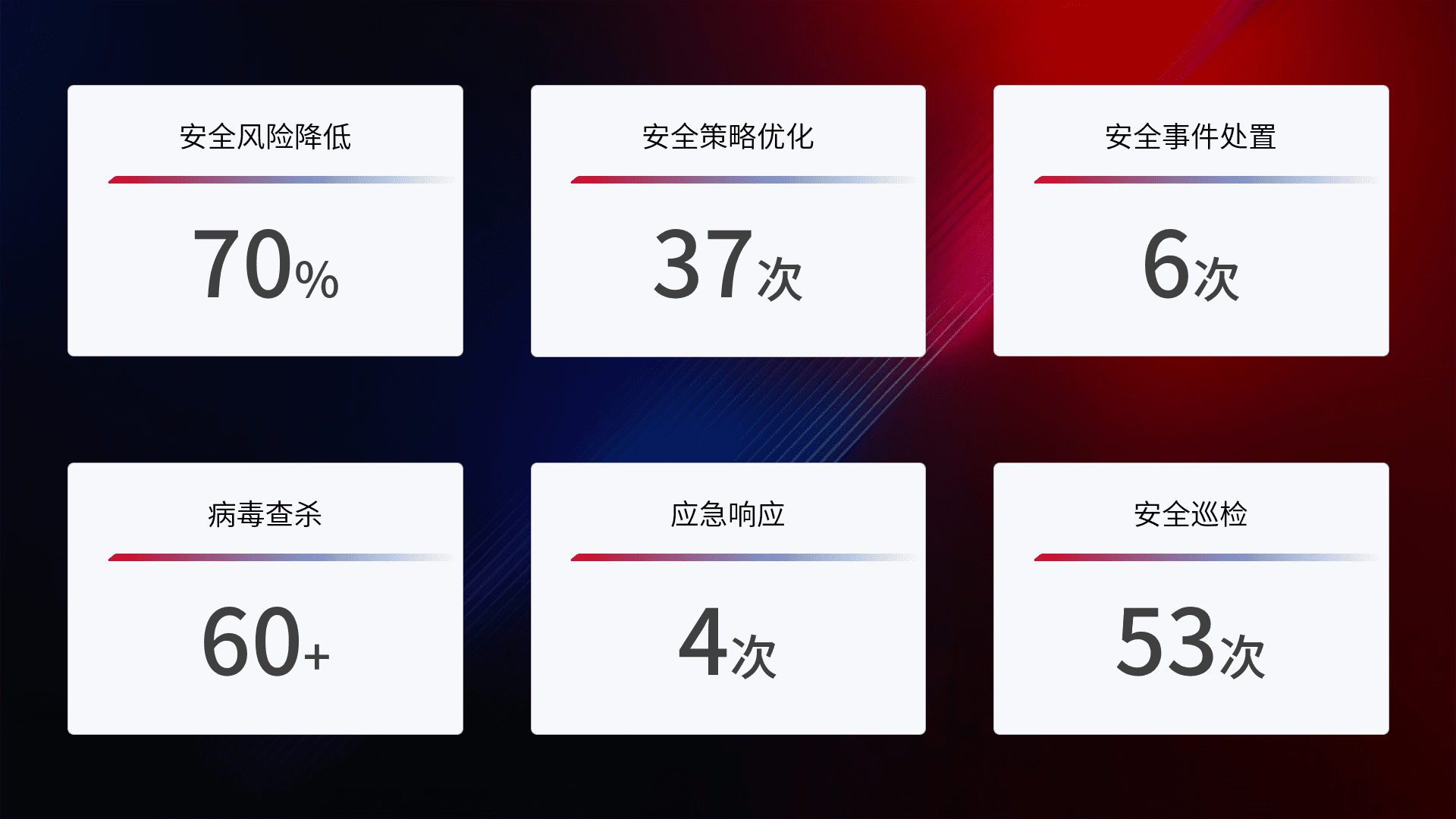 提供全面的安全事件报告体系,,,包括处置报告、、、周报、、、季度和年度总结,,,结合持续监控,,帮助客户深入了解网络安全状况。。。